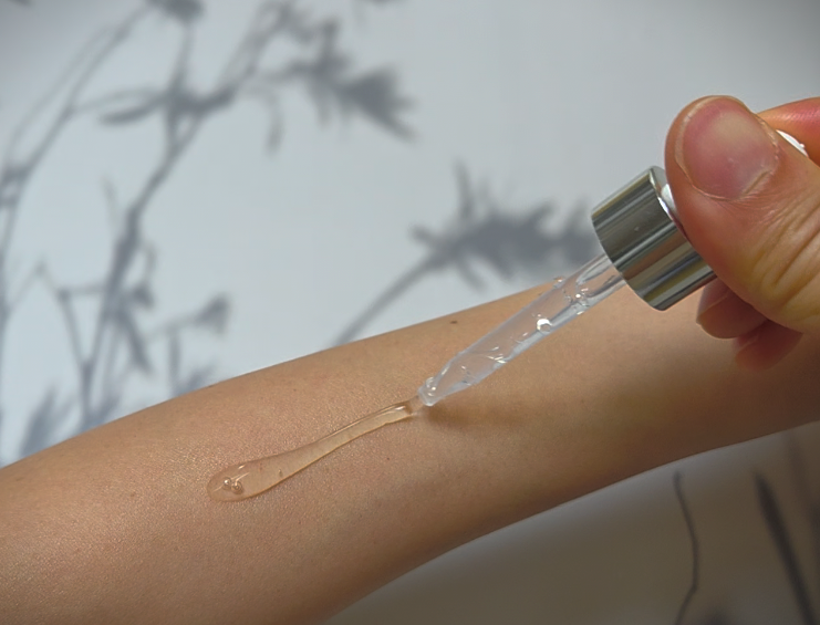 제품은 30ml 스포이드 용기로 위생적인 사용이 가능해요. 제형을 보면 맑고 투명하지만 꽤 묵직한 젤 형태임을 알 수 있습니다. 피부에 닿는 순간 쫀득하게 밀착되며 일종의 '코팅막'을 씌우는 듯한 기분이 들어요.