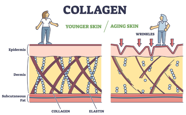 - 진피층의 콜라겐 감소가 주름과 탄력 저하의 주요 원인이다.