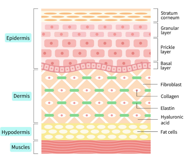 진피층에는 콜라겐, 엘라스틴, 히알루론산과 같은 성분들이 존재하며 이들이 피부의 탄력과 볼륨, 수분을 유지하는 역할을 합니다.