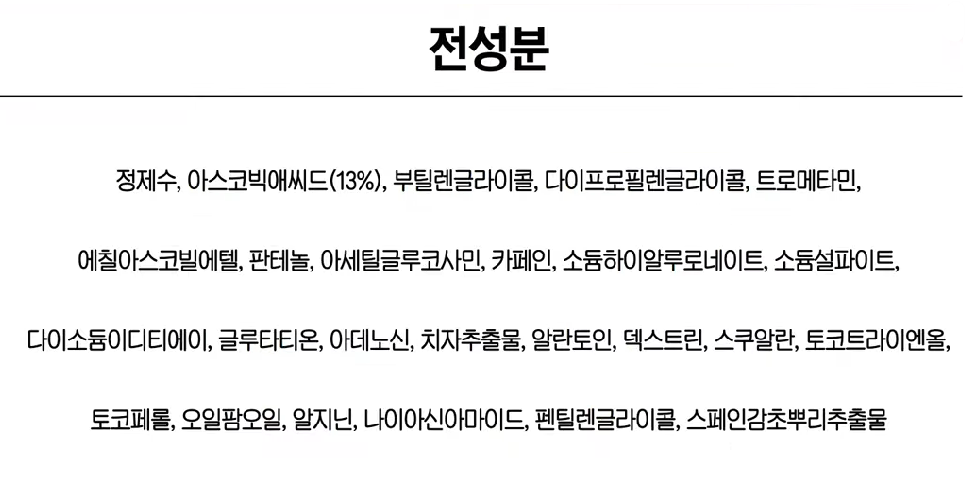 가장 먼저 성분표부터 살펴볼게요. 정제수 바로 다음 순수 비타민C(아스코빅애씨드)가 무려 13%나 함유되어 있어요. 강력한 항산화, 항염 효과는 물론 멜라닌 색소 형성 억제 기능까지 갖춘 핵심 성분이죠. 그 뒤를 이어 안정성을 개선한 비타민C 유도체 '에칠아스코빌에텔'이 미백과 탄력을 돕고, 피부 장벽을 강화하는 '판테놀', 색소침착을 완화하는 '아세틸글루코사민'과 '글루타티온', 주름 개선 기능성 성분인 '아데노신'까지! 전반적으로 항산화, 미백, 보습, 탄력을 모두 잡으려는 똑똑한 조합이라는 걸 알 수 있었어요.