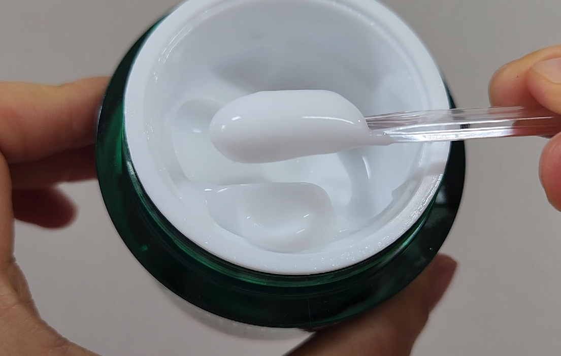 제품은 50ml 용량의 플라스틱 단지형 용기에 담겨 있고, 위생적으로 사용할 수 있는 투명 스파츌라가 함께 들어있어요. 제형은 부드러운 요거트 같은 질감이에요. 펴 바르면 미세한 수분 막이 싹 씌워지는 느낌이 들더라고요.