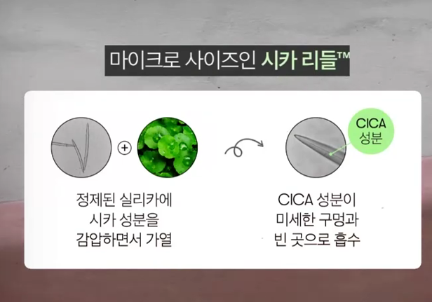 리들샷의 핵심은 바로 '시카리들™'이라는 독자 성분이에요. 아주 미세한 바늘 모양의 자연 유래 입자에 브이티의 핵심 성분인 시카(CICA)를 코팅한 건데요. 이 미세침이 모공보다 14배나 얇은 두께로 피부에 미세한 상처를 내고, 그 통로를 통해 유효 성분의 흡수를 도와 피부 재생을 유도하는 원리랍니다.
