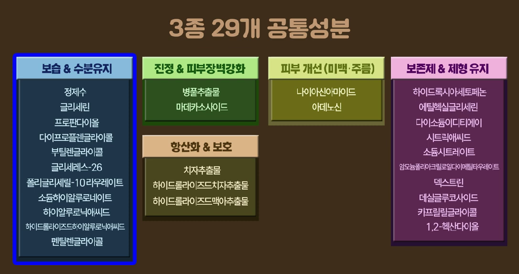 공통 성분 29가지는 크게 보습&수분 유지, 진정&피부장벽강화, 항산화&보호, 피부 개선(미백, 주름개선), 보존제&제형유지 5가지 카테고리로 나눌 수 있어요. 전반적으로 탄탄한 보습 성분 위에 진정, 항산화, 기능성 성분을 균형 있게 더한 구성이라고 볼 수 있습니다.