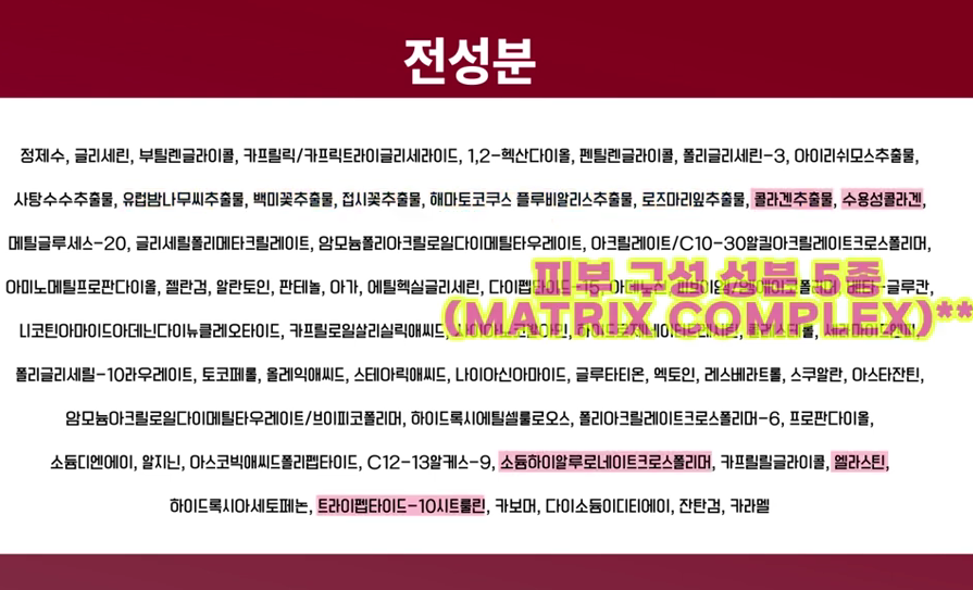 | 피부 구성 5종 (MATRIX COMPLEX) | 수용성콜라겐, 콜라겐추출물, 소듐하이알루로네이트크로스폴리머, 엘라스틴, 트라이펩타이드-10시트롤린 |