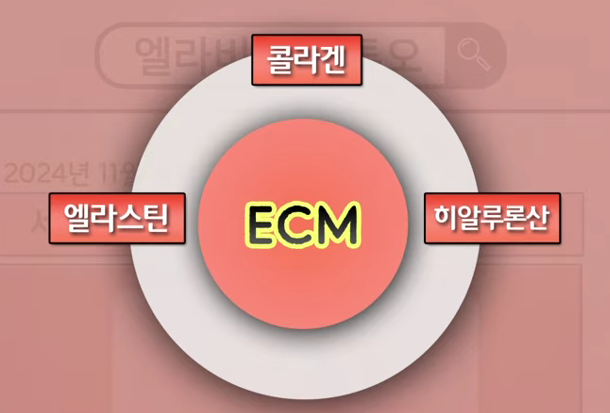 ECM(Extracellular Matrix, 세포외기질)은 콜라겐, 엘라스틴, 히알루론산뿐 아니라 이들의 틀을 유지하는 진피 환경 전체를 의미합니다.