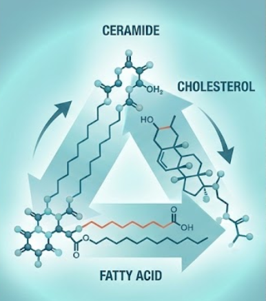 앞서 말한 '시멘트' 역할을 하는 지질 성분이 튼튼해야 피부 수분이 날아가지 않습니다. 이 지질은 크게 세 가지 핵심 성분으로 구성되어 있는데요, 바로 세라마이드(Ceramide), 콜레스테롤(Cholesterol), 지방산(Fatty Acid)입니다. 줄여서 '세.콜.지'라고 많이 부르죠.