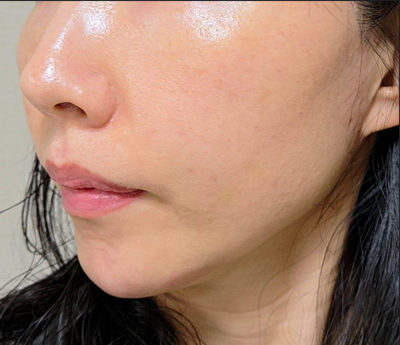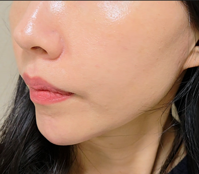 통증은 상대적이지만, 리쥬란 힐러를 맞아본 경험과 비교했을 때 확실히 덜 아팠습니다. (물론 아예 안 아픈 건 아닙니다!) 주입 직후에는 여드름 짠 것처럼 붉은기가 있었지만, 1시간 정도 지나니 금방 가라앉았고 엠보싱 현상은 거의 없었습니다.